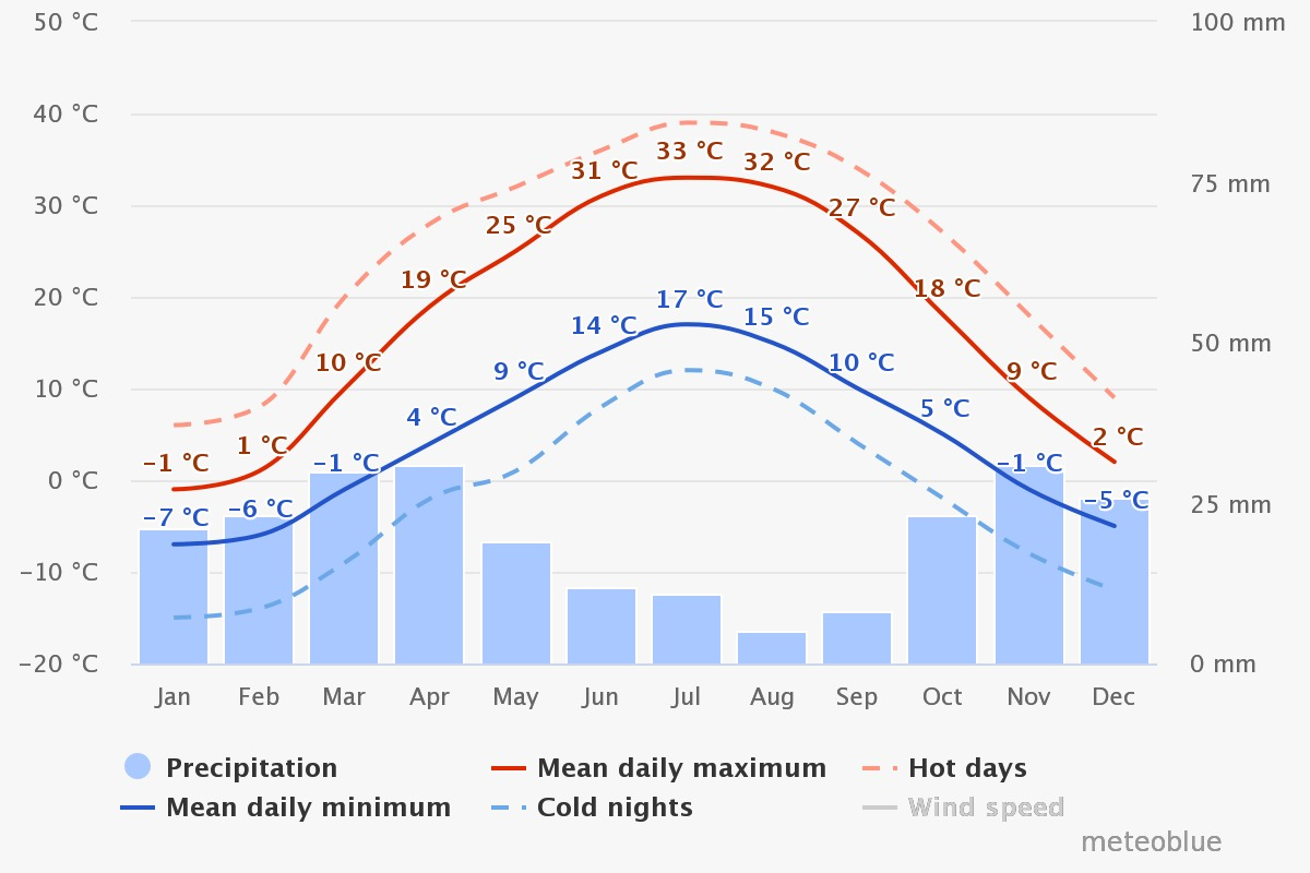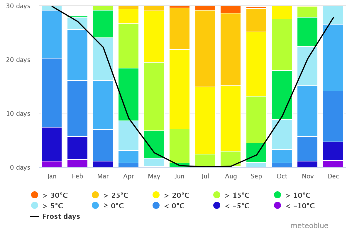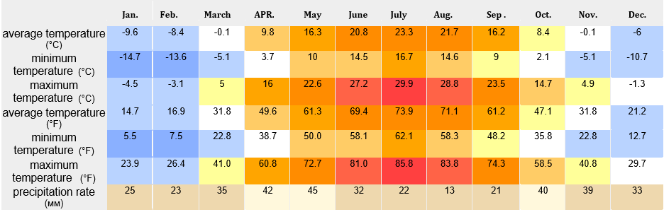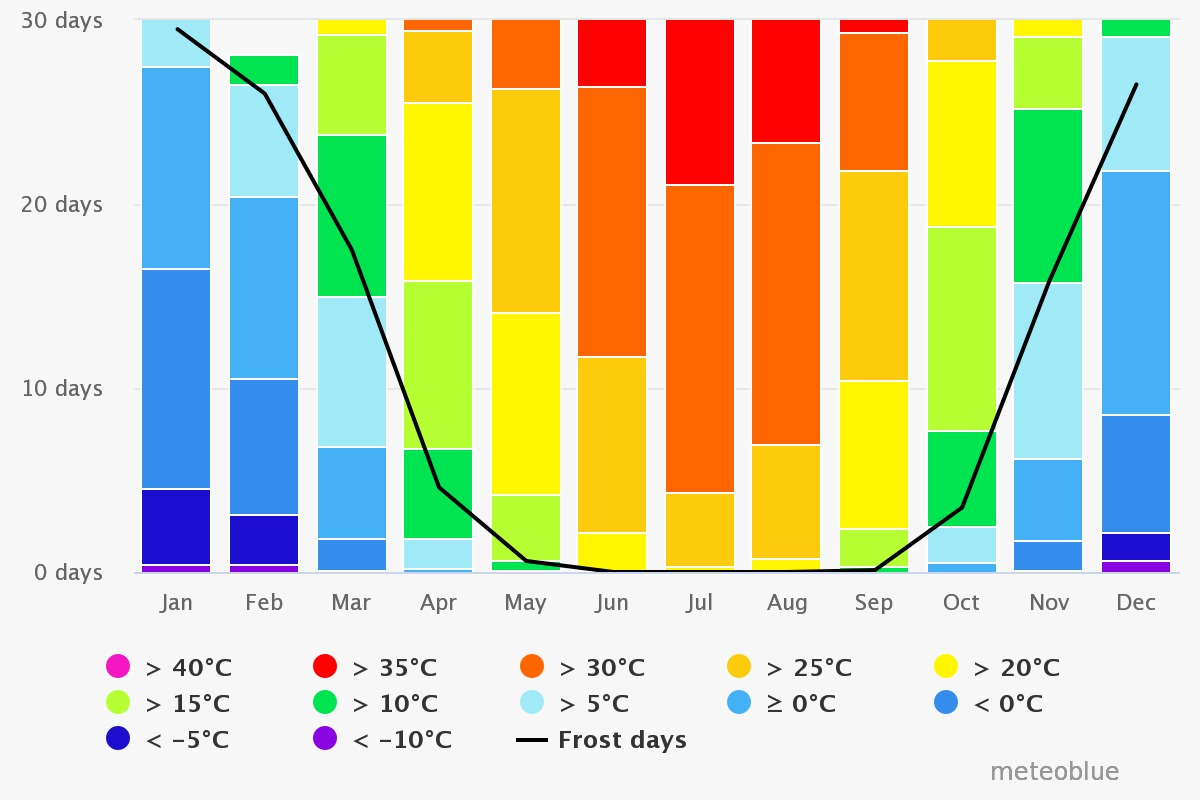 The temperature regime of the city as a whole is much milder than the average in Kazakhstan due to relatively high temperatures in winter. The average long-term air temperature is +10 °C, which is significantly higher than in Moscow and Nur-Sultan. However, due to the high altitude zone and location in the heart of the continent, which quickly cools down in winter, the climate of Almaty is cooler than Tbilisi, Sofia, Barcelona and other Mediterranean cities located on the same 43rd parallel. The temperature of the coldest month (January) is -4.7 °C, and the warmest month (July) is +23.8 °C. Frosts on average start on October 14 and end on April 18. Stable frosts last an average of 67 days — from December 19 to February 23. Weather with a temperature of more than +30 °C is observed on average 36 days a year. In the center of Almaty, as in any major city, there is a "heat island" — the contrast of the average daily temperature between the Northern and southern suburbs of the city is 3.8% and 0.8 °C in the coldest and 2.2% and 2.6 °C in the hottest five days. This is why freezing temperatures in the city center start on average 7 days later and end 3 days earlier than in the Northern outskirts.