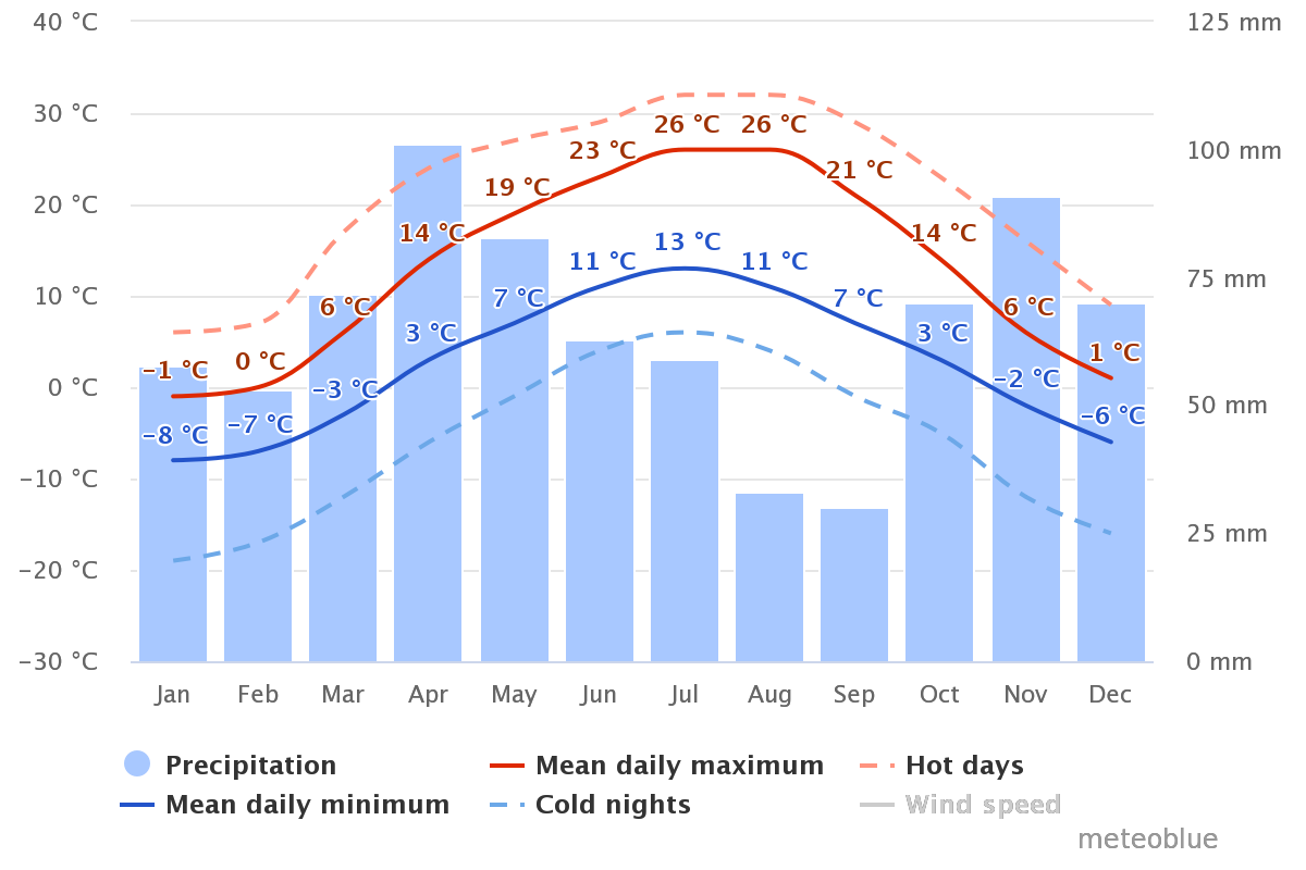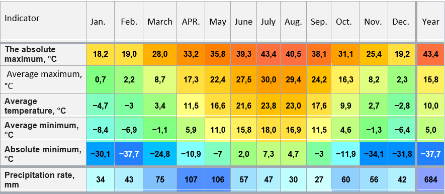 On average, 600-650 mm of precipitation falls per year, with the main maximum in April — may, and the secondary maximum in October-November. The dry season is in August. The average date for the formation of a stable snow cover is November 30, although its appearance ranges from November 5 to December 21. The average snowfall date is March 15 (ranges from February 26 to March 29). Fog is observed 50-70 days a year in the city and its surroundings.